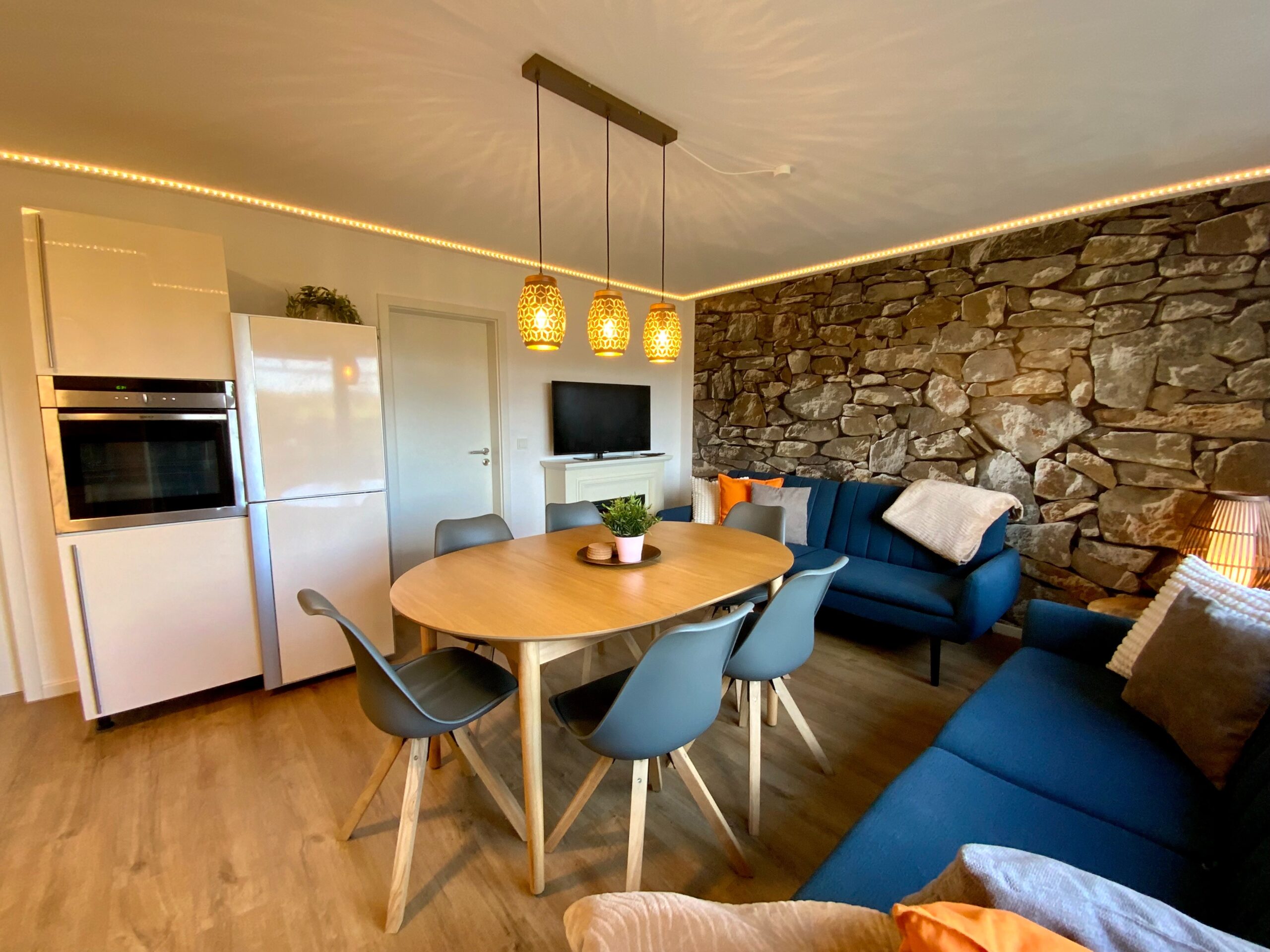 Das Wohn- und Esszimmer mit Blick ins Grüne und direktem Zugang auf die gepflasterte Terrasse. Im Wohn-/Esszimmer befindet sich einen Elektro (Kamin) der für eine gemütliche Wärme sorgt.